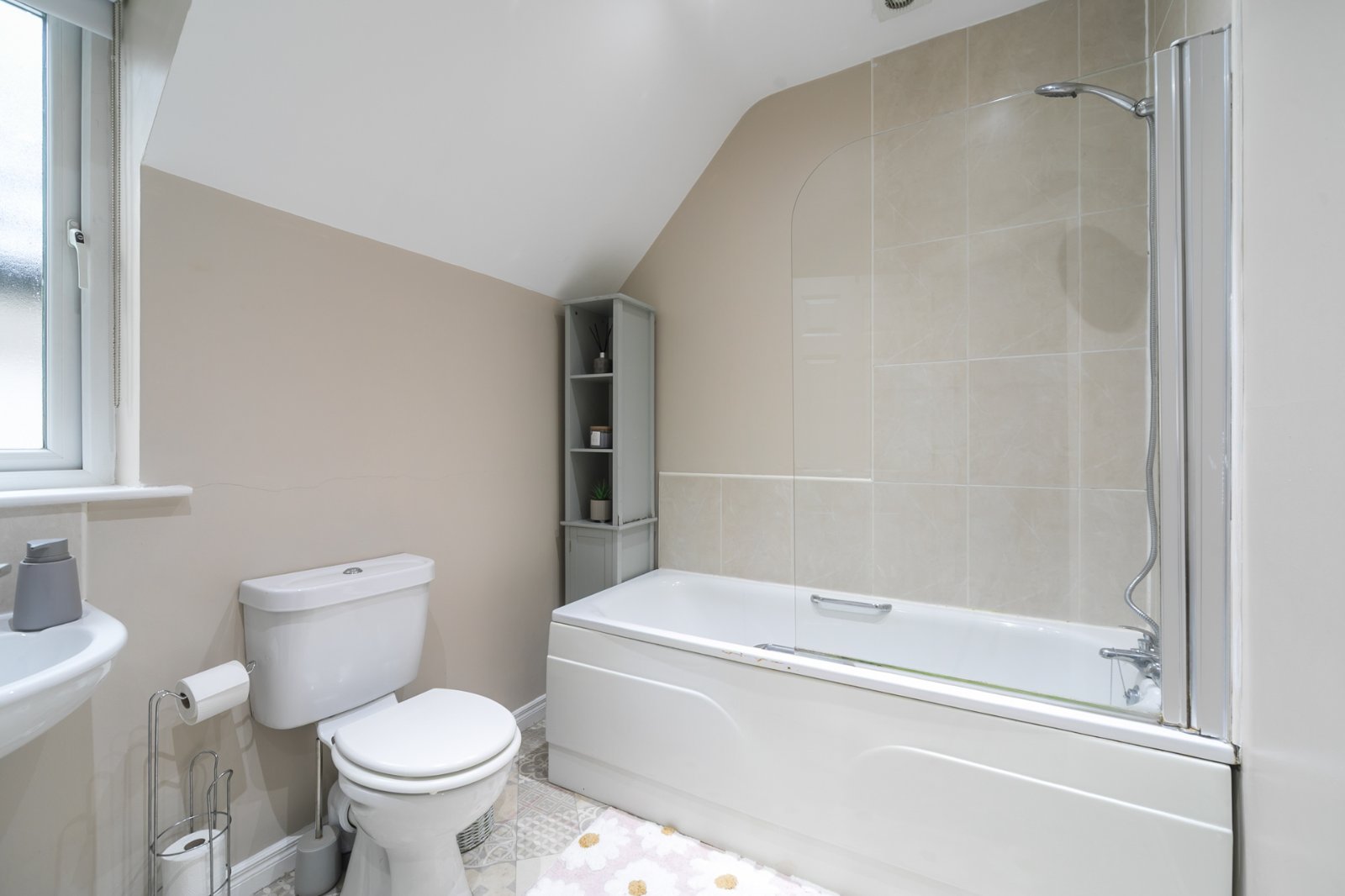 Low flush WC, pedestal wash hand basin, bath with shower above, part tiled walls, extractor fan, spotlighting