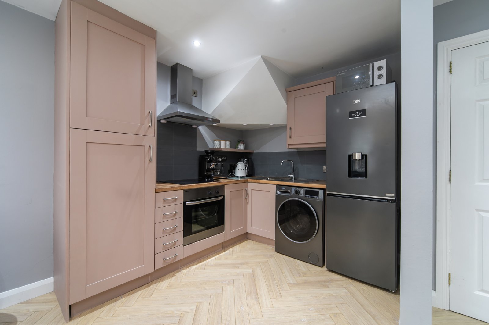 Laminate wood floor, range of high and low level units, under bench electric oven, 4 ring ceramic hob, space for fridge, plumbed for washing machine, stainless steel sink unit, extractor fan, part tiled walls
