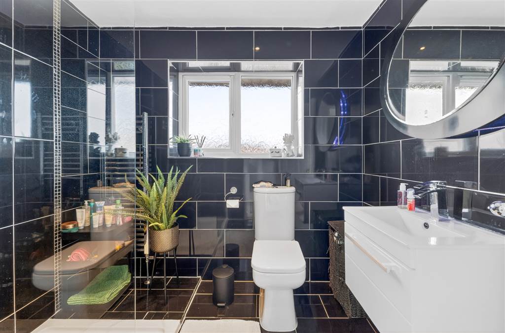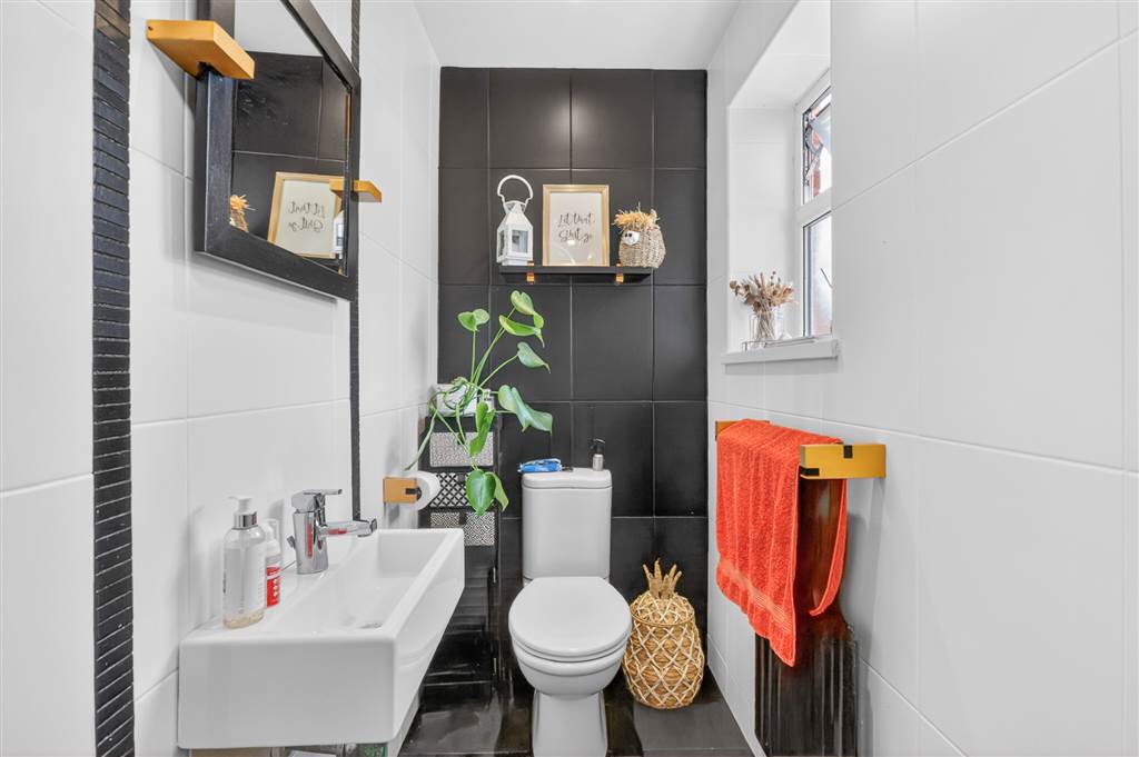 White suite. Wash hand basin. Low flush WC. Tiled walls and floor. Extractor fan. Recessed lights.