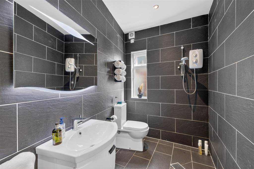 (at maximum points) Converted to leisure room. Range of high and low level units. One and a half bowl stainless steel sink unit with mixer taps. Recessed lights. Wetroom with electric shower. Vanity unit with wash hand basin. Heated chrome towel rail. Recessed lights.