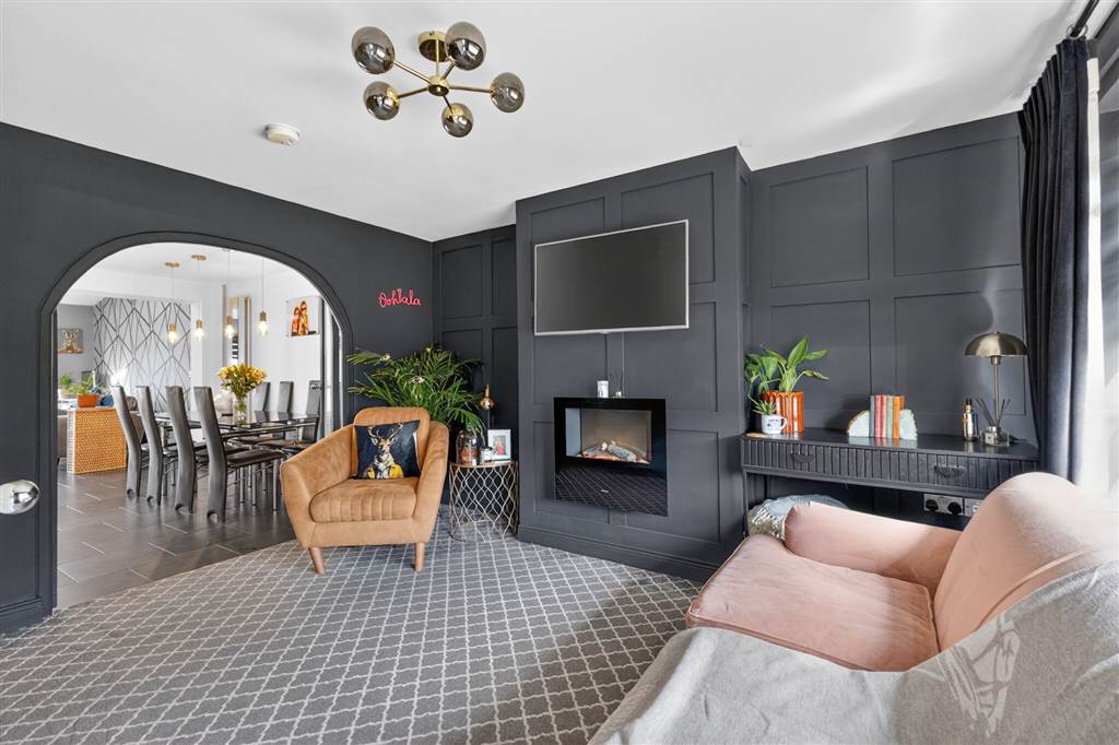 Feature contemporary wall mounted fire. Attractive wood panelling. French doors to dining area.