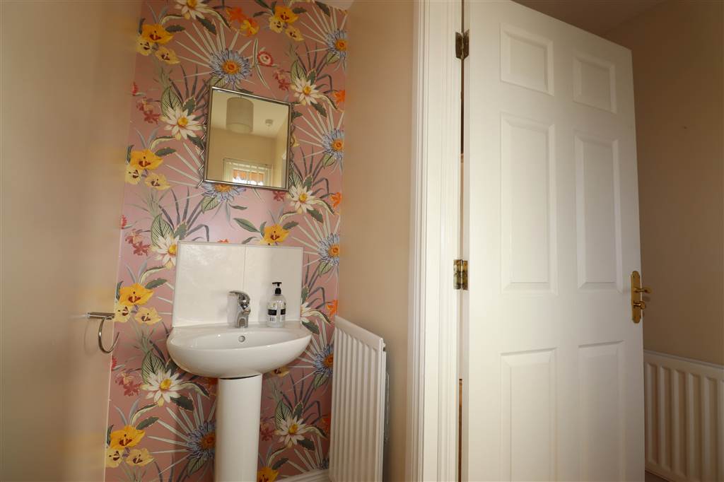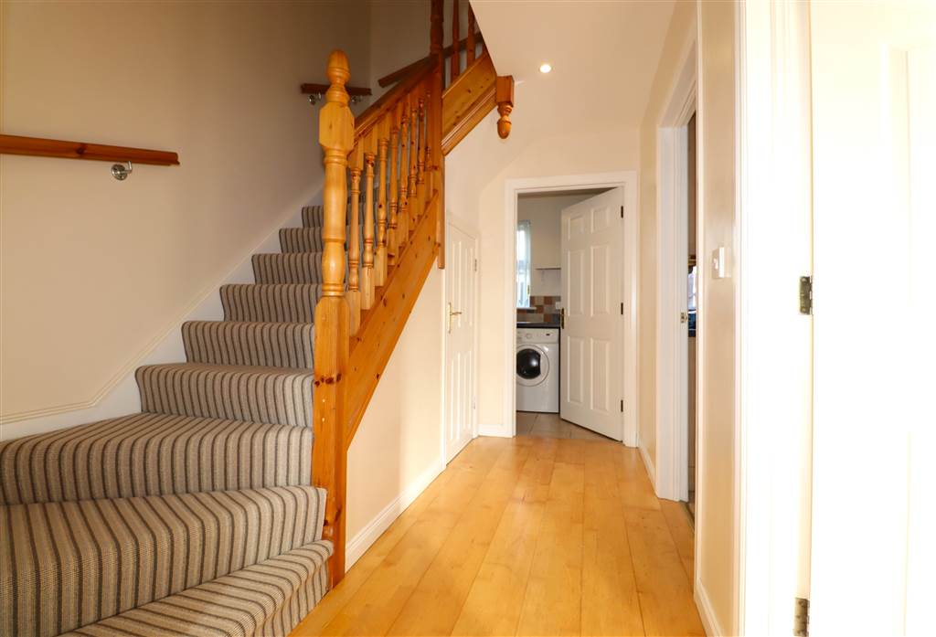 Inside, the accommodation is both bright and welcoming. The entrance hall leads to a spacious lounge featuring a charming fireplace with a gas fire, creating a warm focal point. The modern kitchen enjoys abundant storage and opens to a generous dining area, perfect for everyday family living. A separate utility room and a convenient ground-floor WC add further practicality.