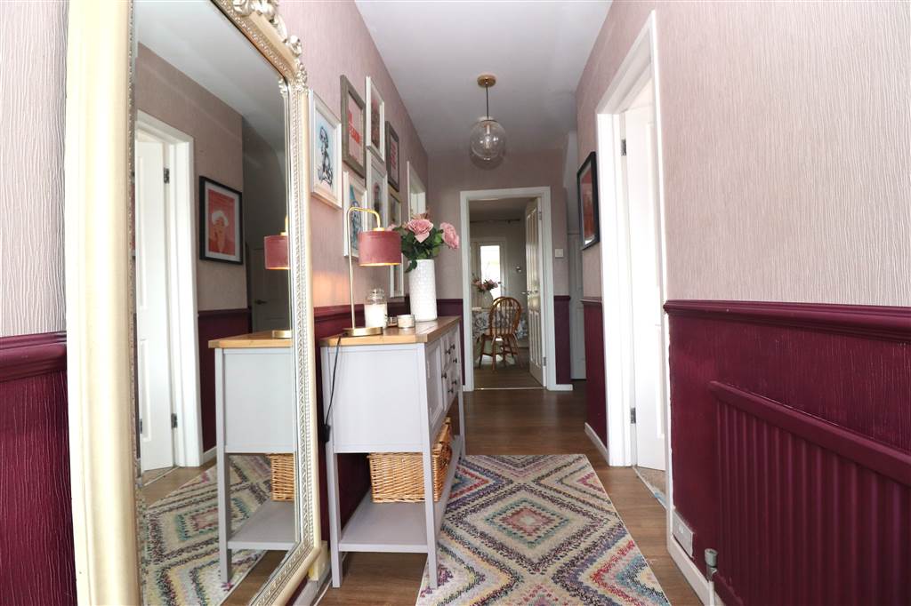 UPVC double glazed inner door. Laminate flooring. Dato rail. Built in cupboard. Understairs storage cupboard. Glazed door to lounge.