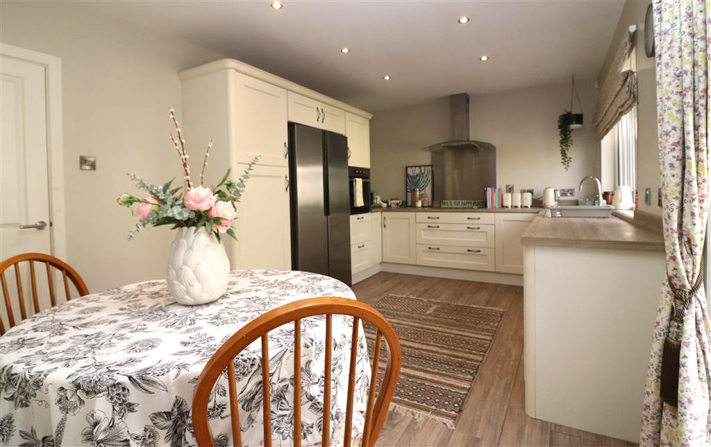 Excellent range of high and low level units. One and a half bowl stainless steel sink unit with mixer taps. Buil in hob and oven. Space for American style fridge/freezer. Extractor fan. Integrated dishwasher. Pull out bin storage. Recessed lights. Tiled floor. Vertical radiator. UPVC french door to rear garden.