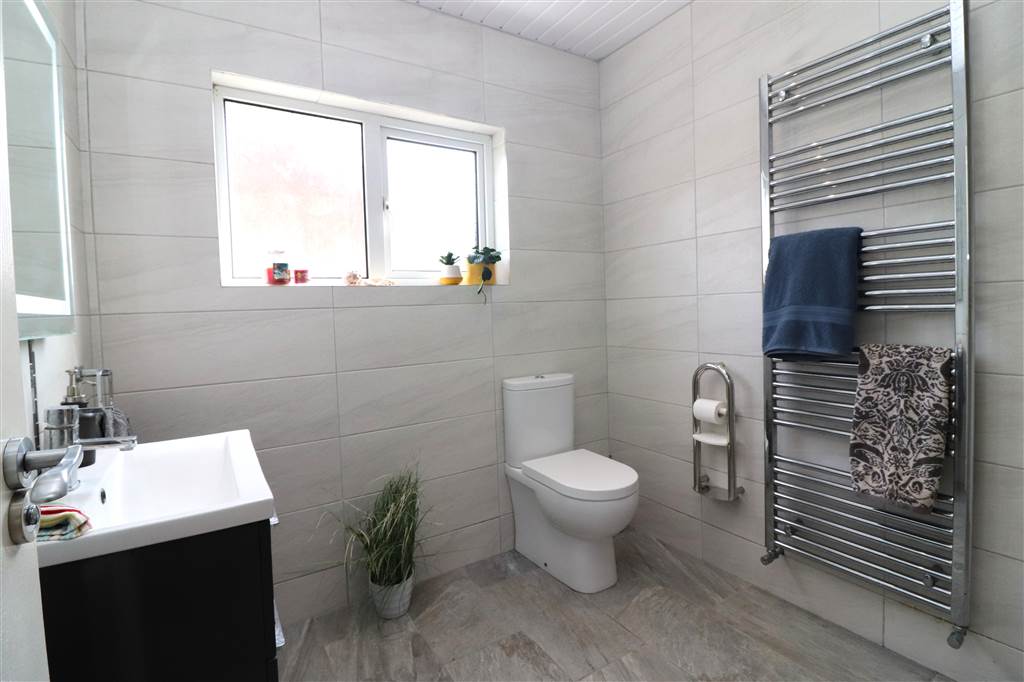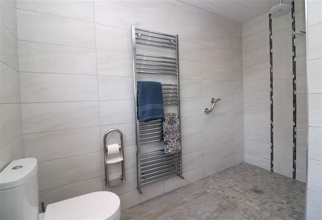 White suite. Thermostatically controlled hand and rainshower. Vanity unit with wash hand basin. Low flush WC. Heated chrome towel rail. Fully tiled. PVC panelled ceiling with recessed lights.