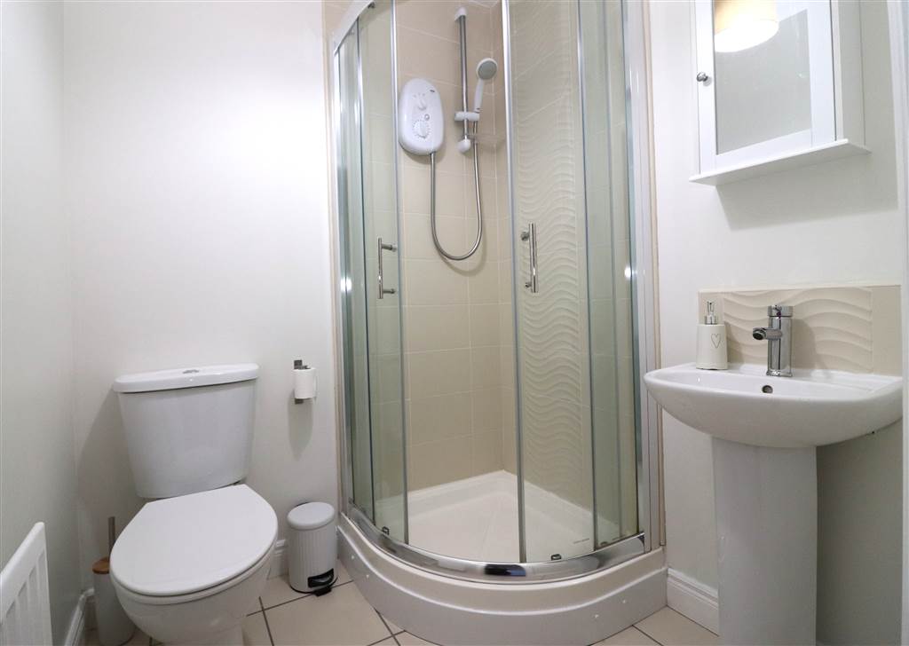 White suite. Corner tiled shower cubicle with electric shower. Pedestal wash hand basin. Low flush WC. Tiled floor. Extractor fan.