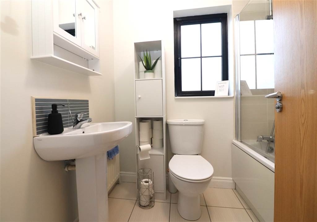 White suite. Panelled bath with mixer taps and shower attachment. Shower screen. Pedestal wash hand basin. Low flush WC. Tiled floor. Extractor fan.