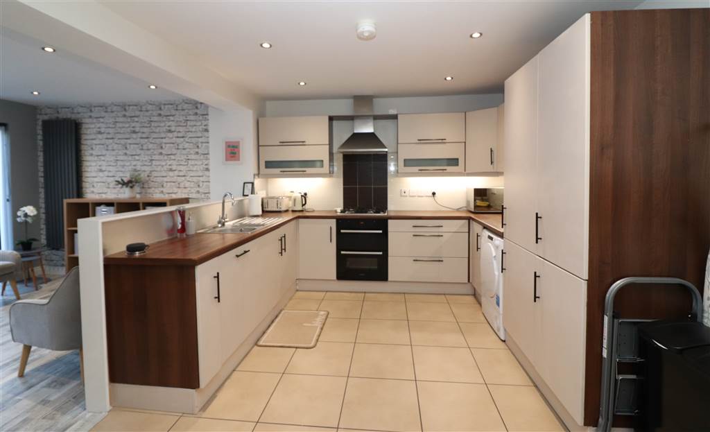 Excellent range of high and low level units. Built in stainless steel gas hob and electric oven. Integrated dishwasher. Plumbed for washing machine. Integrated fridge/freezer. Tiled floor. Recessed lights. Part tiled walls. One and a half bowl stainless steel sink unit. Open plan to sun room: