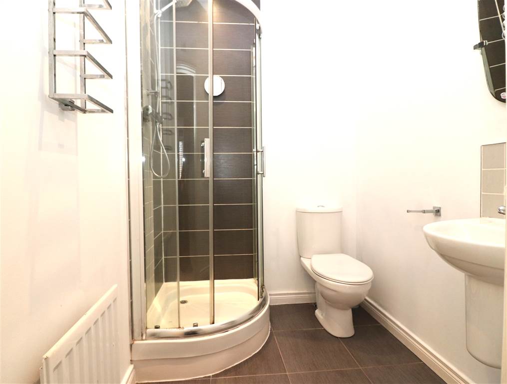 White suite. Shower cubicle with hand and rain shower. Wash hand basin. Low flush WC. Tiled floor. Extractor fan. Recessed lights. Part tiled walls.