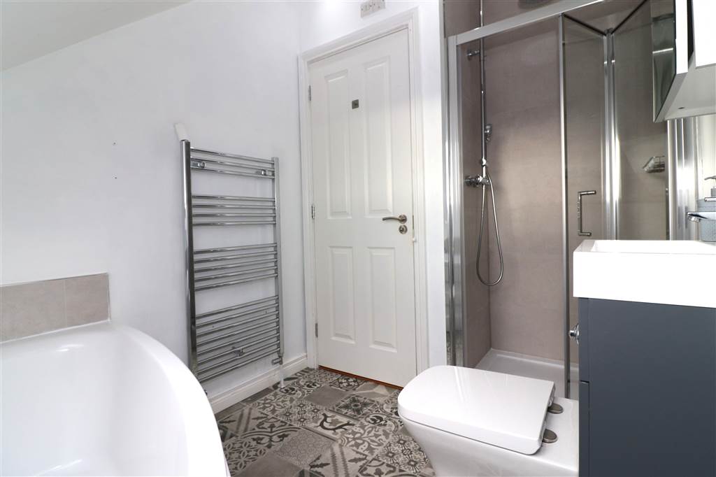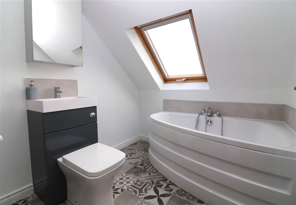 White suite. Corner bath with mixer taps and shower attachment. Shower cubicle with hand and rainshower. Wash hand basin. Low flush WC. Heated chrome towel rail. Part tiled walls. Extractor fan. Velux window.