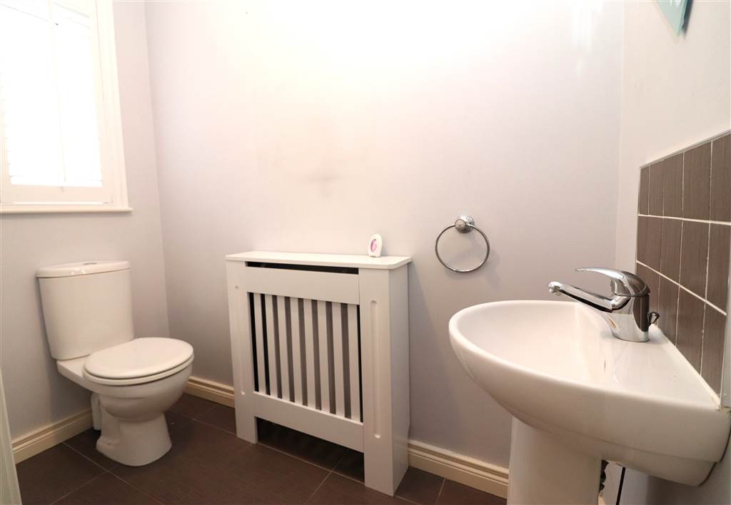 White suite. Pedestal wash hand basin. Low flush WC. Tiled floor. Extractor fan. Windows shutters.