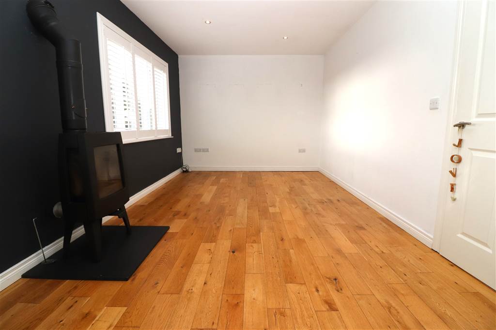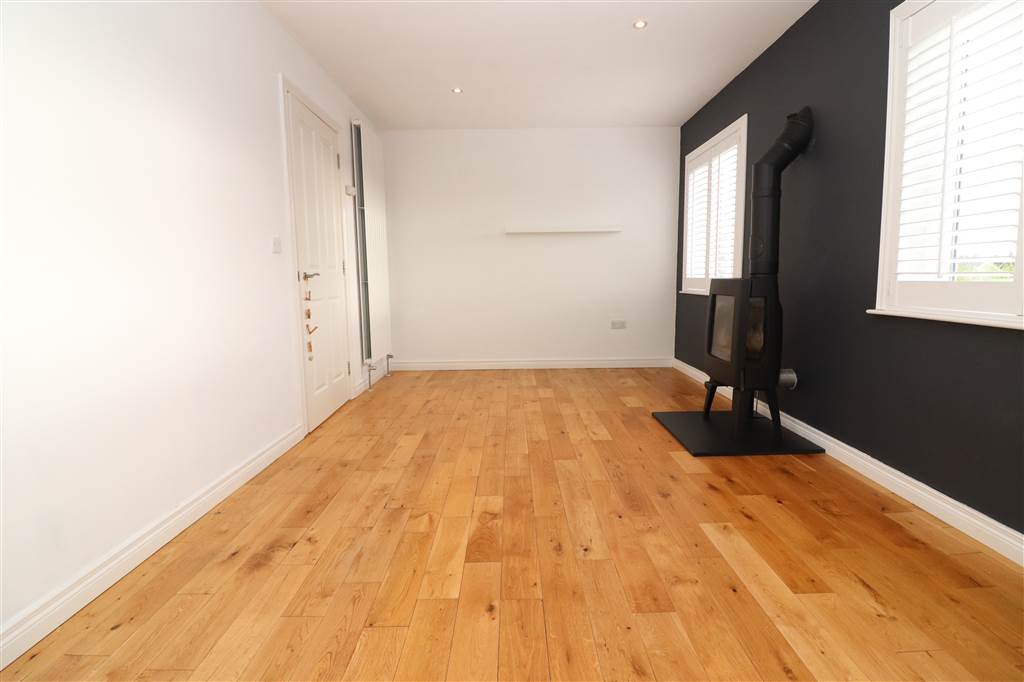 Feature woodburning stove. Wooden floor. Double aspect windows with window shutter.