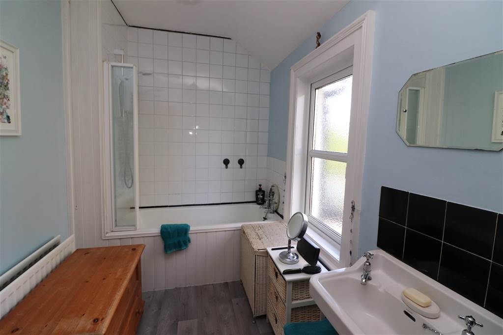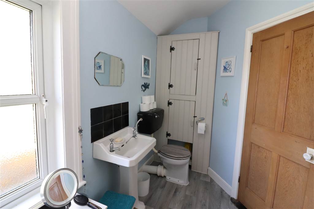 White suite. Panelled bath with shower screen and Mira electric shower. Pedestal wash hand basin. WC. Hotpress. Part tiled walls. Access to roofspace.