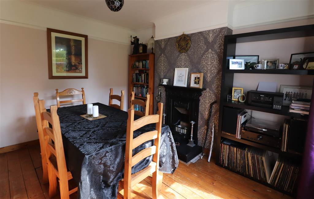 Feature fireplace with cast iron inset, slate hearth and open fire. Picture rail. Coved ceiling. Reclamed floorboards.