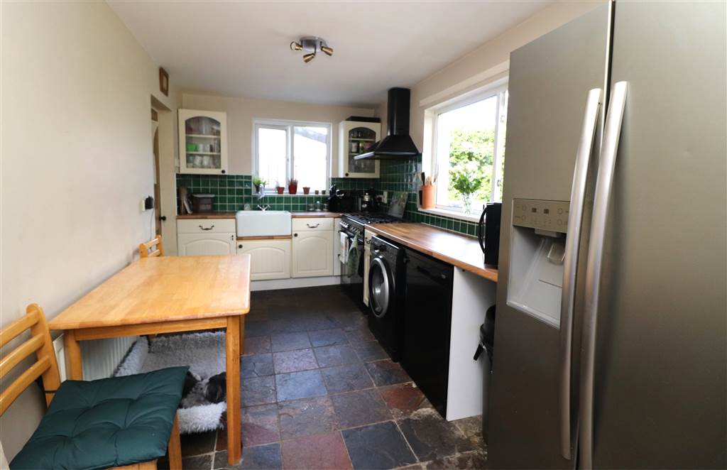 Good range of high and low level units. Belfast sink unit with mixer taps. Smeg range cooker with 5 gas rings, electric grill and two ovens. Extractor fan. Plumbed for washing machine and dishwasher. Slate flooring. Access to roofspace. Useful understairs storage cupboard. Part tiled walls.