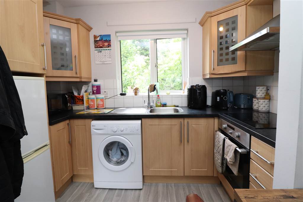 Range of high and low level units. Single drainer stainless steel sink unit with mixer taps. Built in hob and under oven. Stainless steel extractor fan. Plumbed for washing machine. Space for fridge/freezer. Part tiled walls.