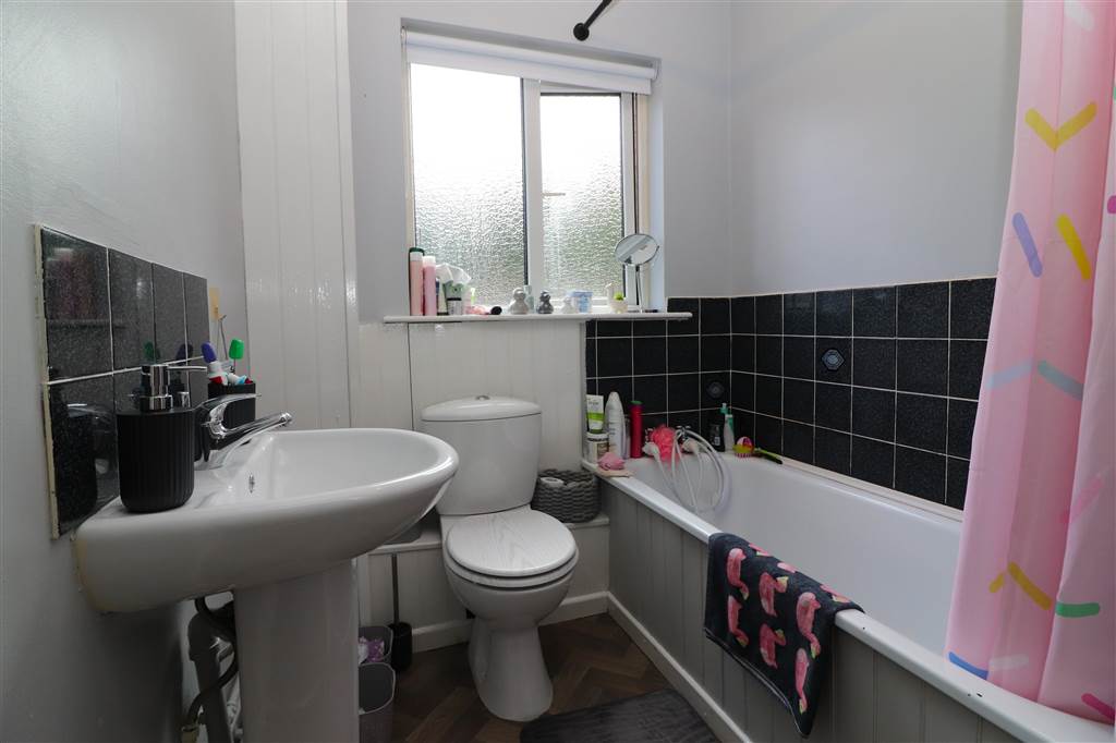 White suite. Panelled bath. Pedestal wash hand basin. Low flush WC. Part tiled walls.