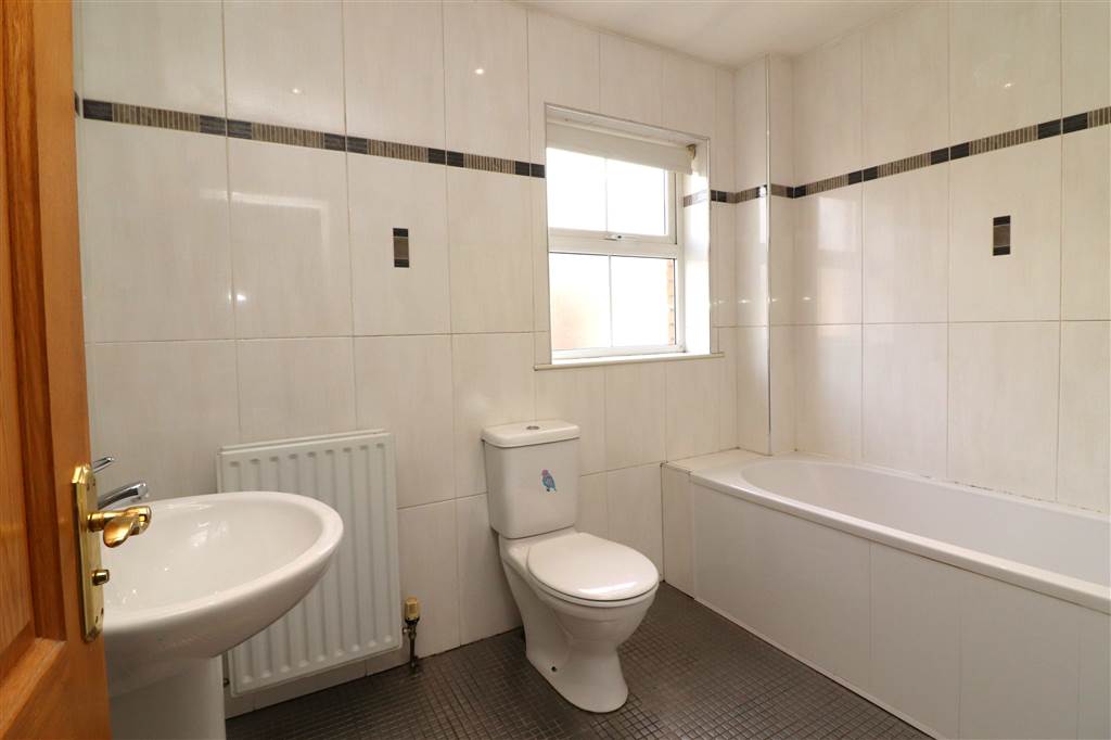 White suite. Panelled bath with mixer taps and shower attachment. Pedestal wash hand basin. Low flush WC. Tiled walls and floor. Recessed lights.