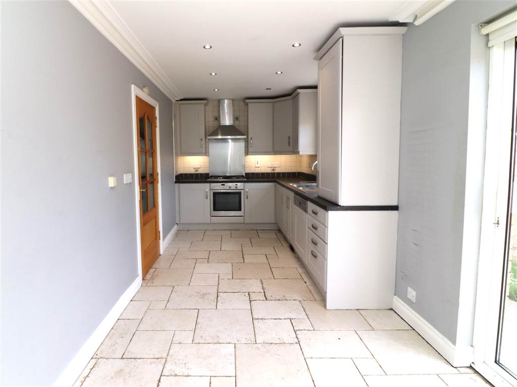 Good range of high and low level units. One and a half bowl stainless steel sink unit with mixer taps. Space for fridge/freezer. 5 ring gas hob and electric under oven. Stainless steel extractor fan. Wine rack. Integrated dishwasher. French doors to rear. Recessed lights. Tiled floor. Part tiled walls.