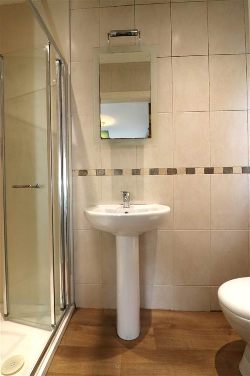 White suite. Shower cubicle with thermostatically controlled shower. Pedestal wash hand basin. Low flush WC. Tiled walls. Recessed lights. Extractor fan.
