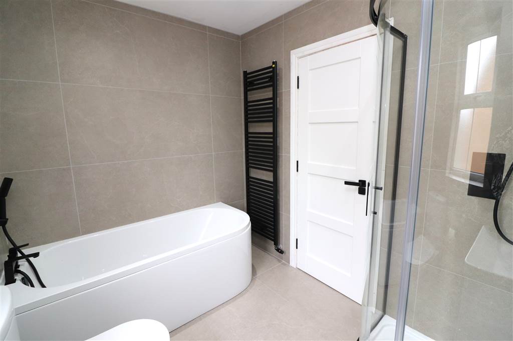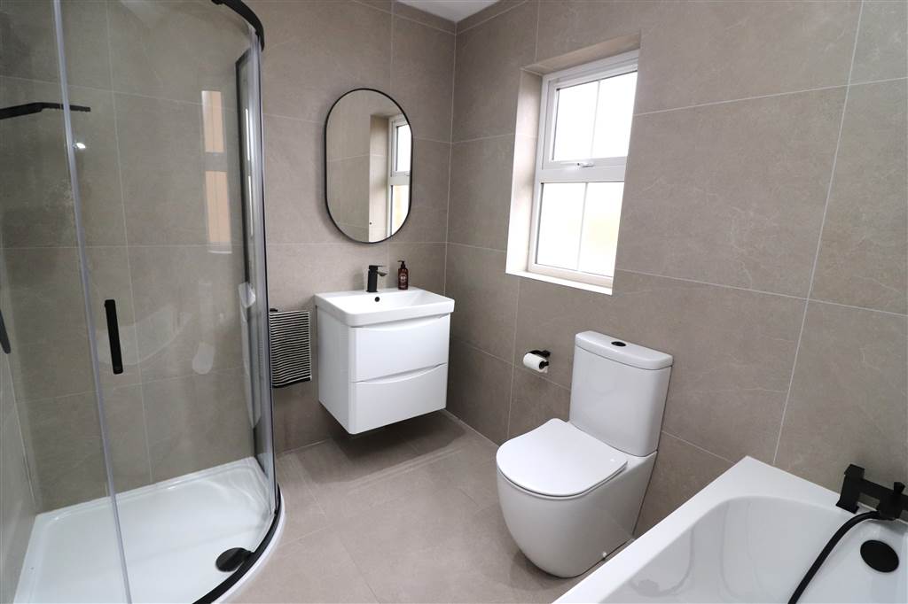 White suite. Panelled bath with mixer taps and shower attachment. Corner shower cubicle with rain and hand shower. Vanity unit with wash hand basin. Low flush WC. Fully tiled. Recessed lights. Extractor fan. Vertical radiator.