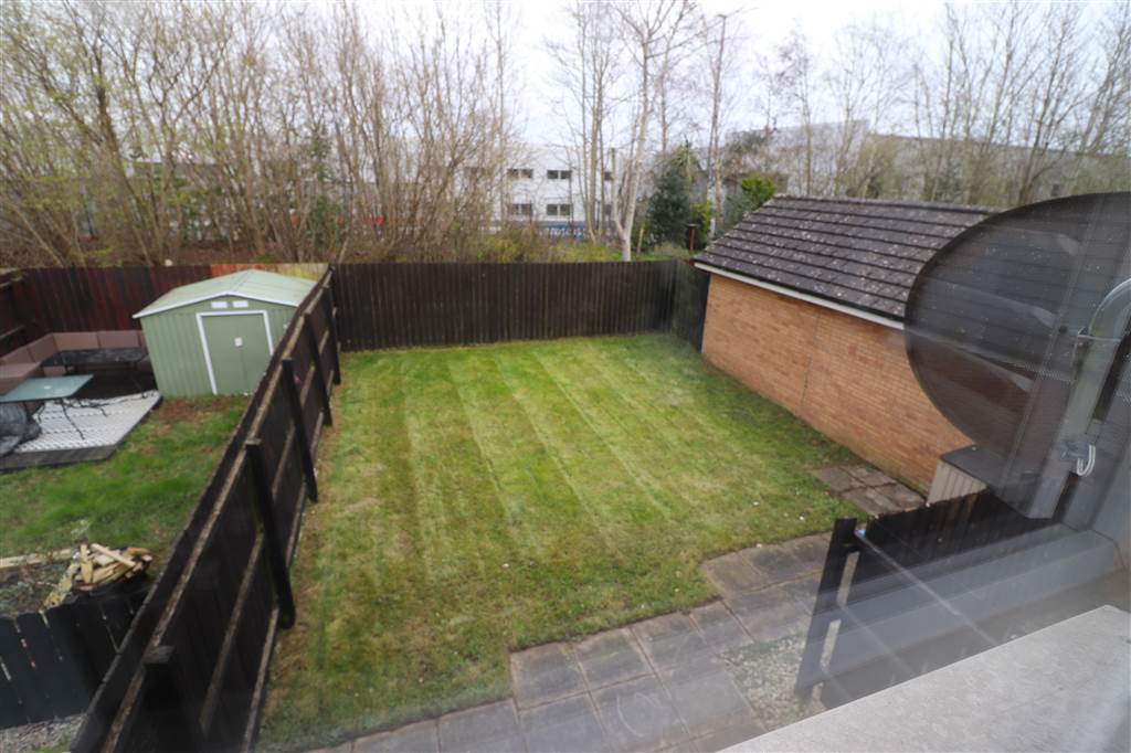 Tarmac driveway. Front garden in lawn. Large rear garden in lawn enclosed by fencing. Outside light and tap.