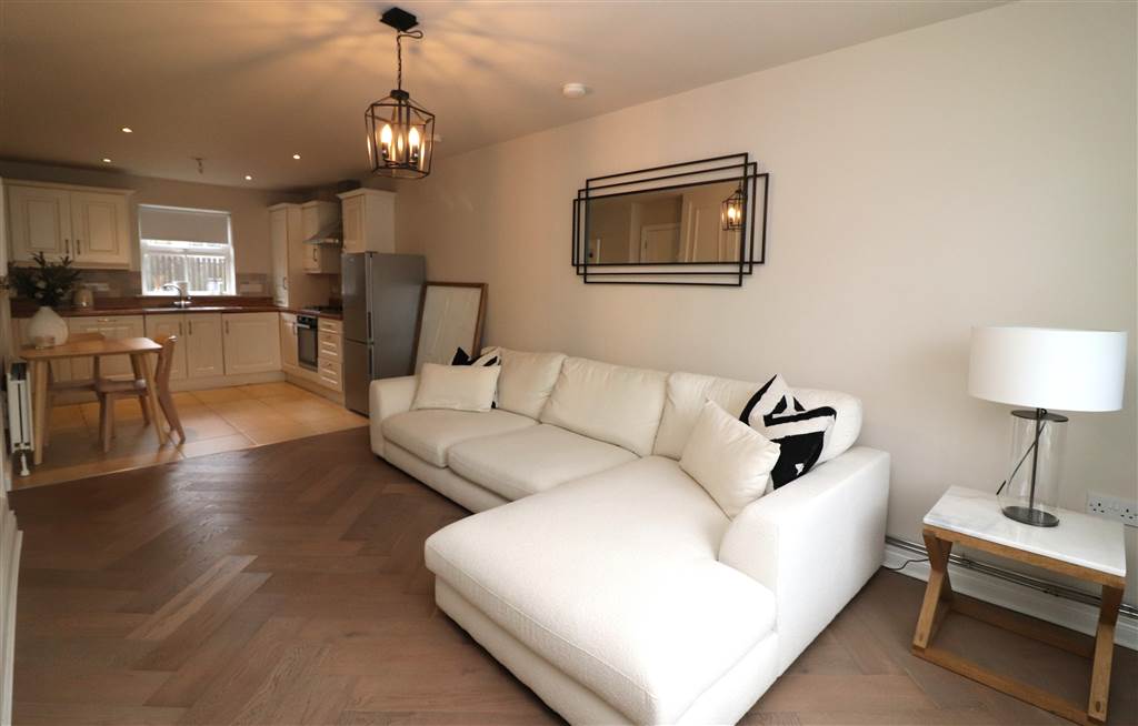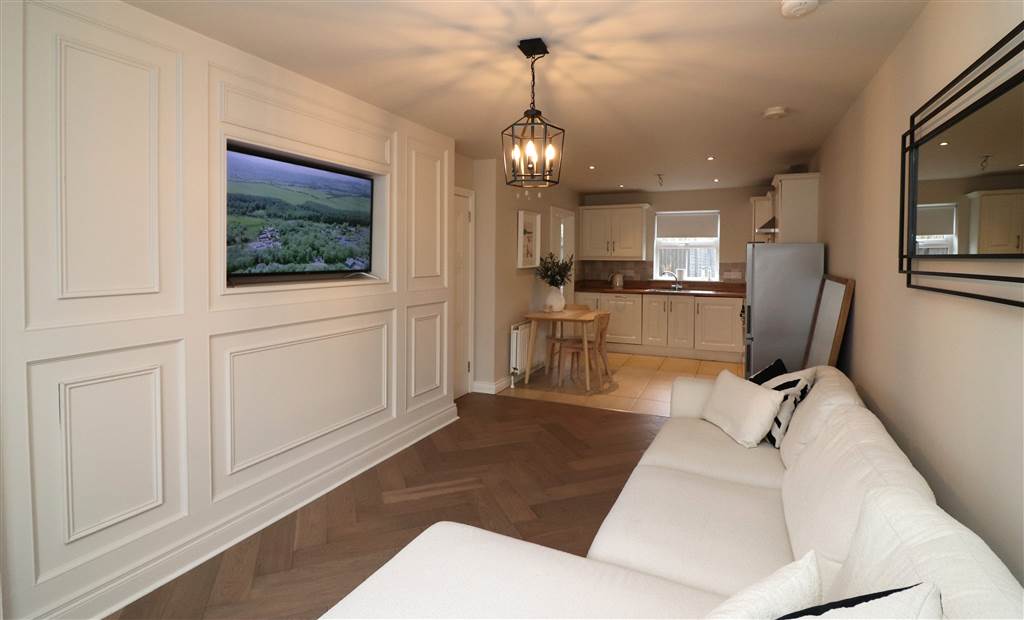 Feature wall panelling and media wall. Herringbone floor. Vertical radiators. Understairs storage cupboard. Open plan to kitchen: