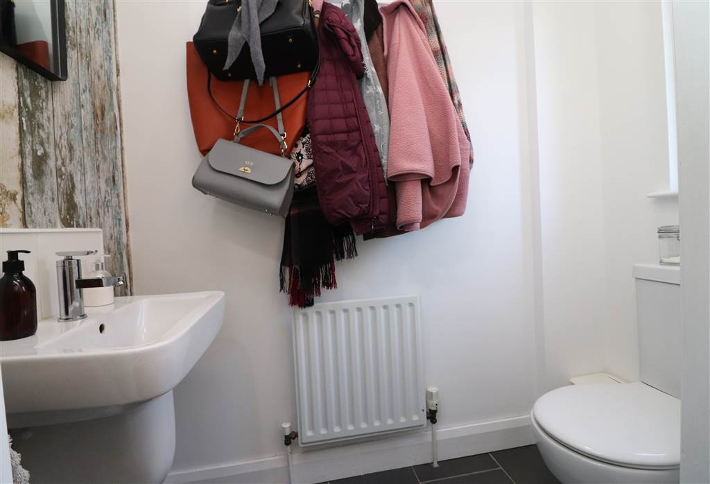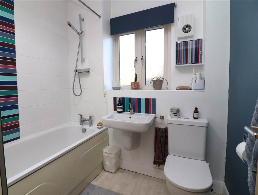 White suite. Panelled bath. Wash hand basin. Low flush WC. Heated chrome towel rail. Part tiled walls. Extractor fan.
