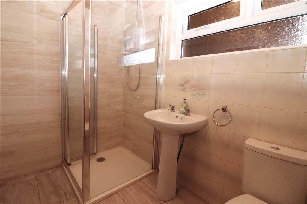White suite. Shower cubicle with Triton electric shower. Pedestal wash hand basin. Low flush WC. Fully tiled.