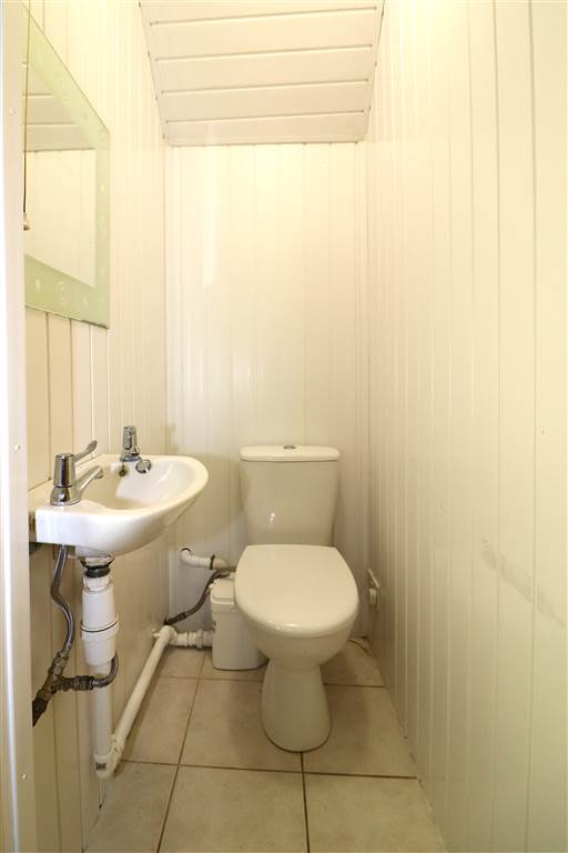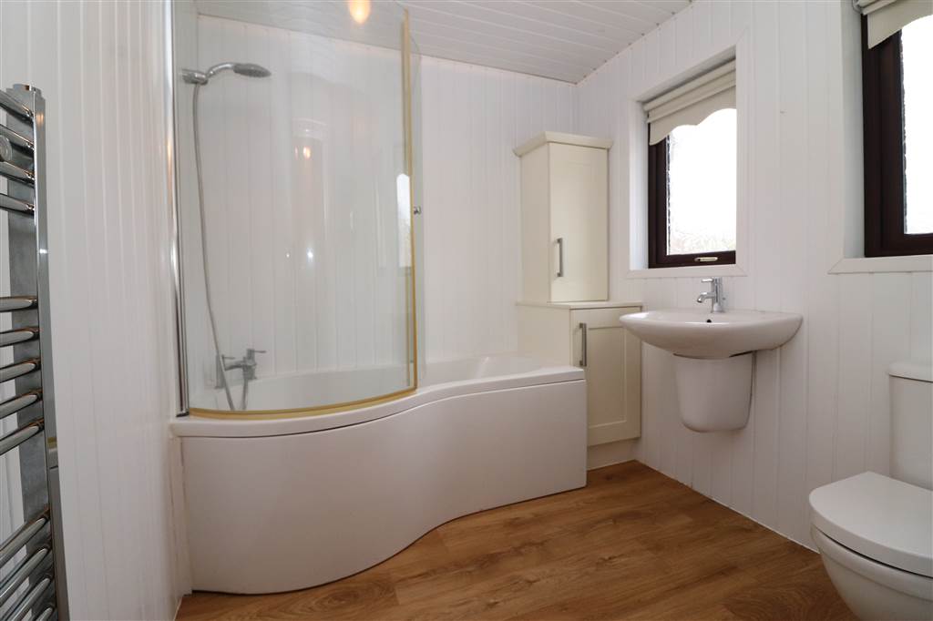 White suite. Panelled bath with mixer taps and shower attachment. Pedestal wash hand basin. Low flush WC. PVC wall panelling.