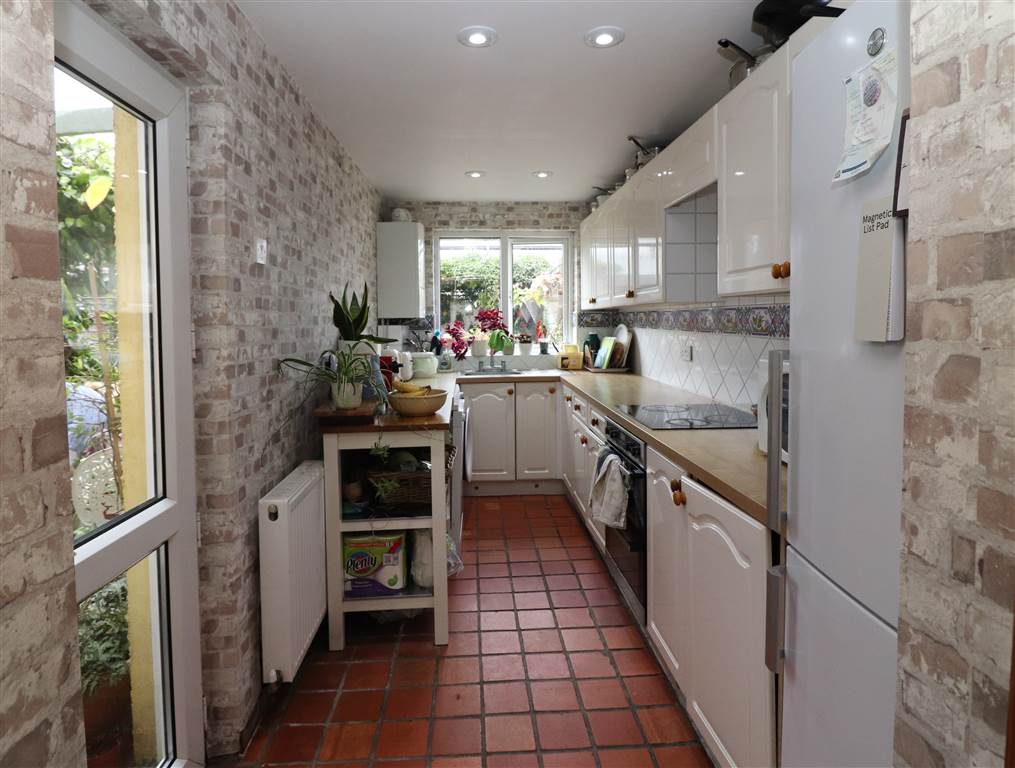 Good range of high and low level units. Built in hob and double oven. Plumbed for washing machine and dishwasher. Single drainer steel sink unit with mixer taps. Part tiled walls. Tiled floor. Recessed lights. Gas boiler.