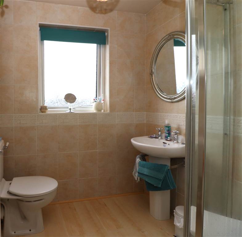 White suite. Shower cubicle with thermostatically controlled shower. Pedestal wash hand basin. Low flush WC. Laminate flooring. Tiled walls.