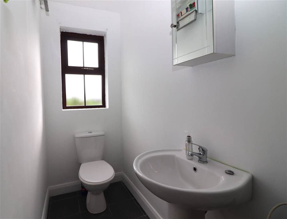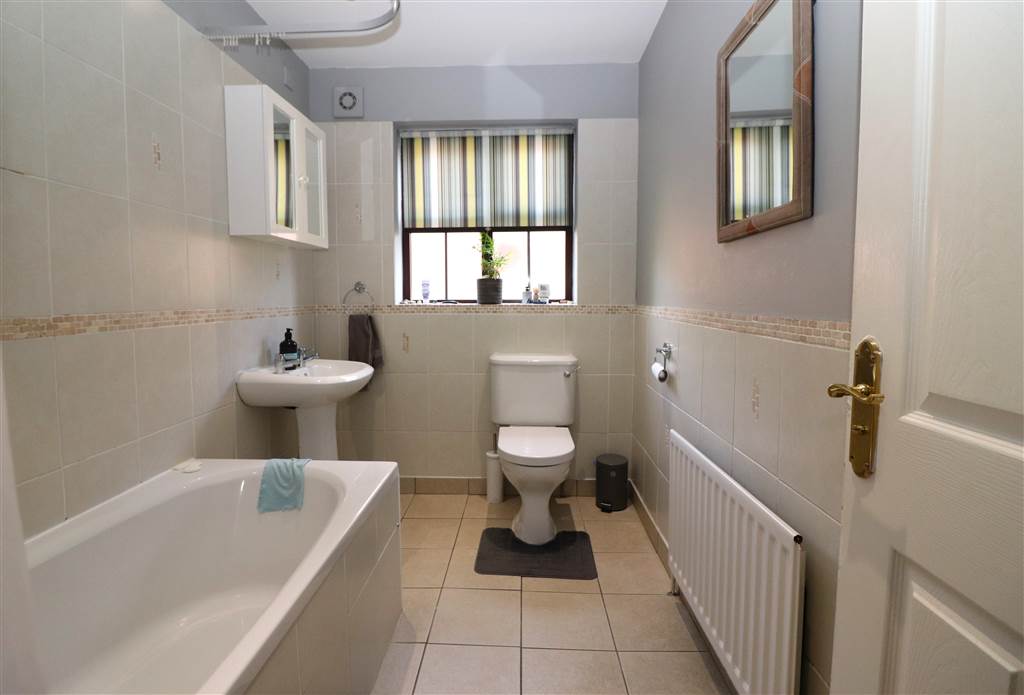 White suite. Bath with mixer taps and shower attachment. Pedestal wash hand basin. Low flush WC. Part tiled walls. Tiled floor. Extractor fan. Recessed lights.