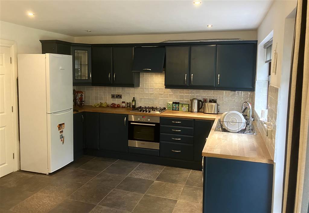 Excellent range of high and low level units. One and a half bowl stainless steel sink unit with mixer taps. Plumbed for washing machine. Built in gas hob and electric under oven. Glazed display cabinets. Cooker filter. Tiled floor. Display cabinets. Recessed lights.