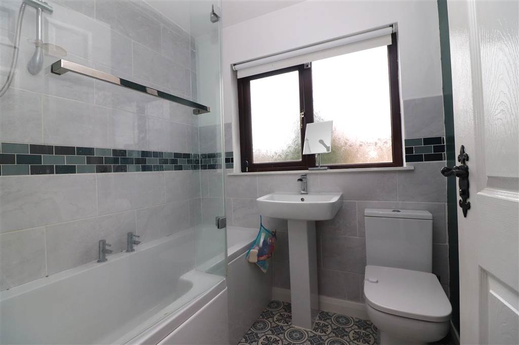 White suite. Panelled bath with shower screen and Triton electric shower. Pedestal wash hand basin. Low flush WC. Part tiled walls.