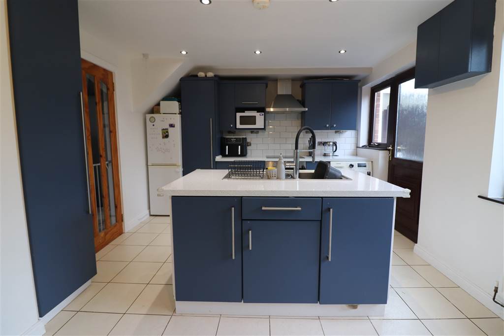 Excellent range of high and low level units. Built in hob and under oven. Extractor fan. Island unit with one and a half bowl stainless steel sink unit with mixer taps. Part tiled walls. Recessed lights. Tiled floor. Plumbed for washing machine. Space for fridge/freezer.