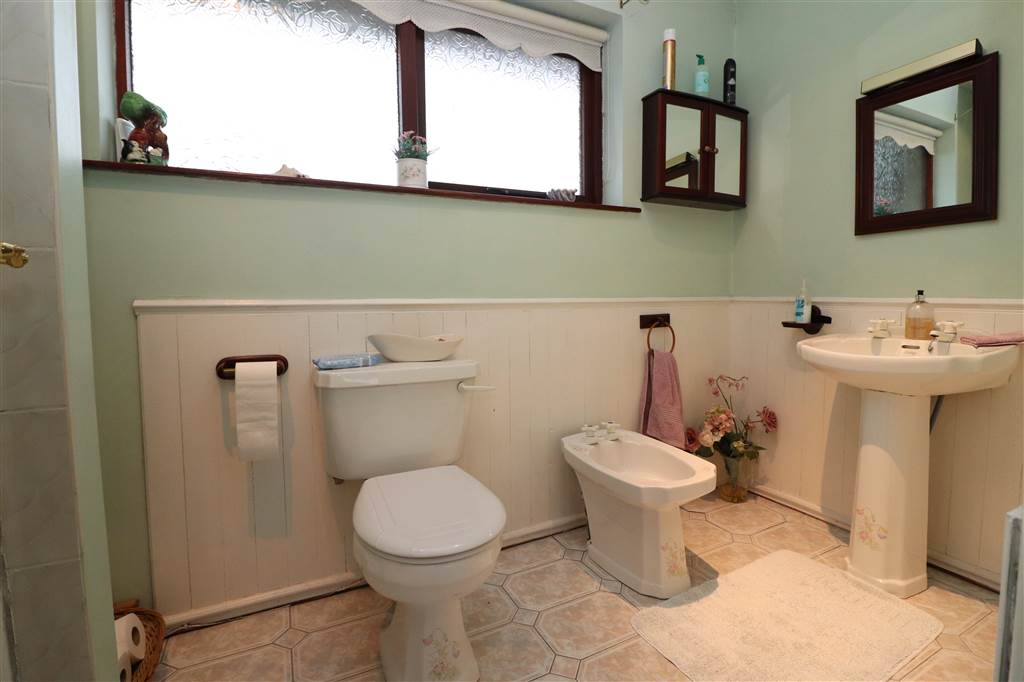 White suite. Shower cubicle with Mira electric shower. Pedestal wash hand basin. Low flush WC. Bidet. Recessed lights. Extractor fan. Tiled floor.
