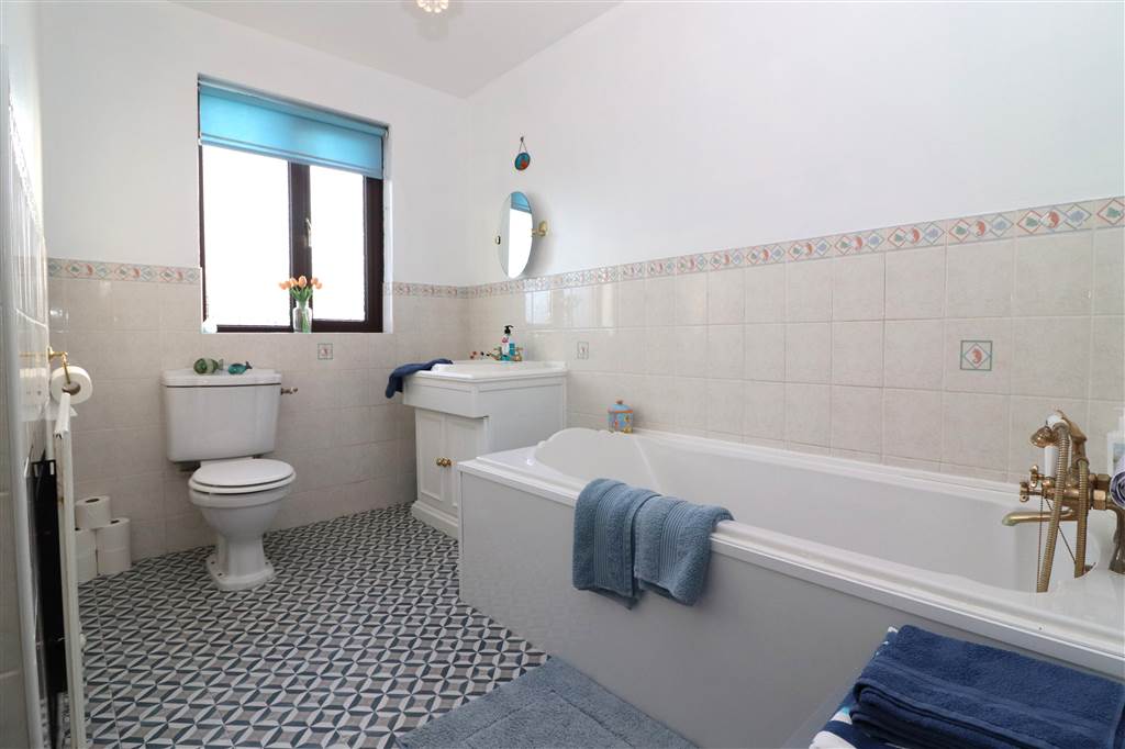 White suite. Panelled bath with mixer taps and shower attachment. Vanity unit with wash hand basin. Low flush WC. Tiled floor. Half tiled walls.