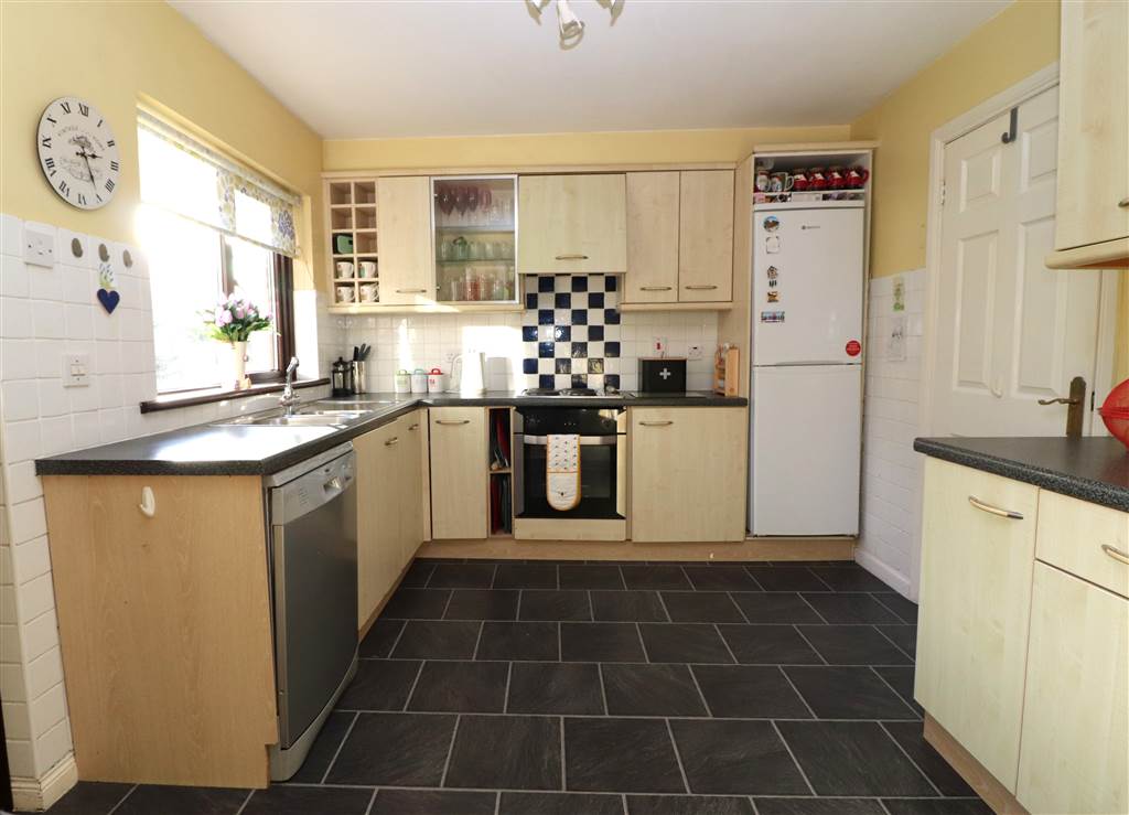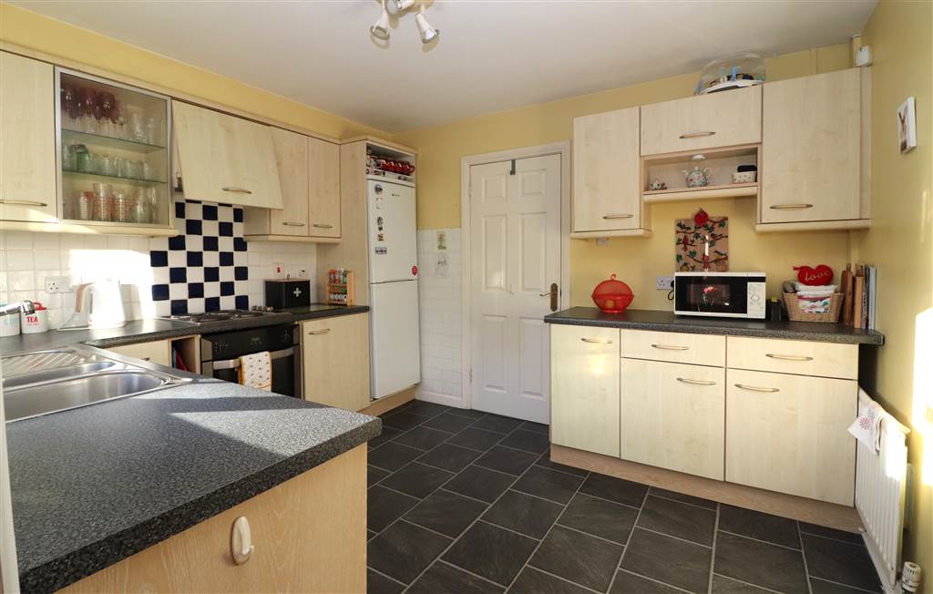 Range of high and low level units. Built in hob and oven. One and a half bowl stainless steel sink unit with mixer taps. Wine rack. Space for fridge/freezer. Plumbed for dishwasher. Glazed display cabinets. Part tiled walls.
