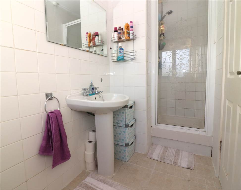 White suite. Shower cubicle with Aqualisa shower. Pedestal wash hand basin. Low flush WC. Fully tiled. Extractor fan.