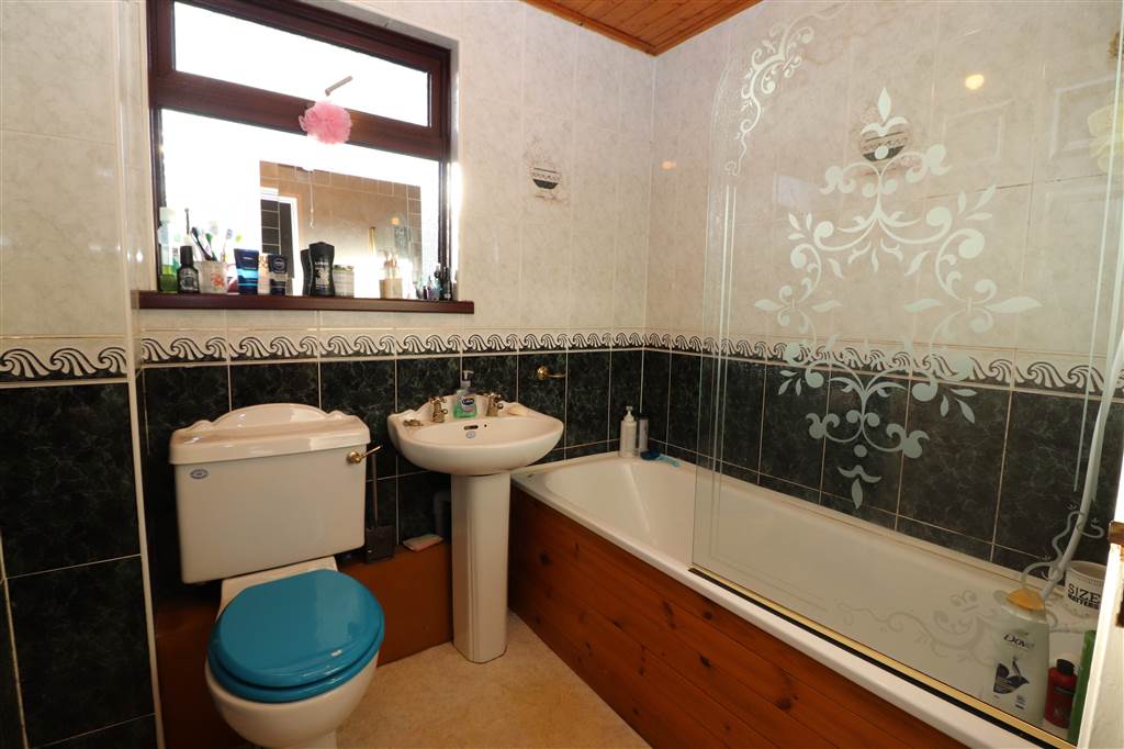 White suite. Panelled bath with electric shower and shower screen. Pedestal wash hand basin. Low flush WC. Tiled walls. Pine panelled ceiling.