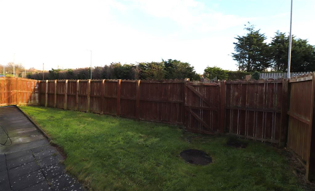 Front garden in lawn with mature shrubs, enclosed by fencing. Completely enclosed rear garden in lawn with paved patio area. Garden shed. Outside tap.