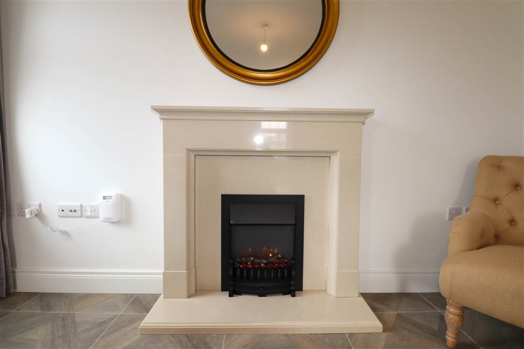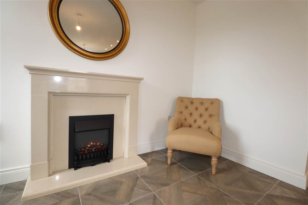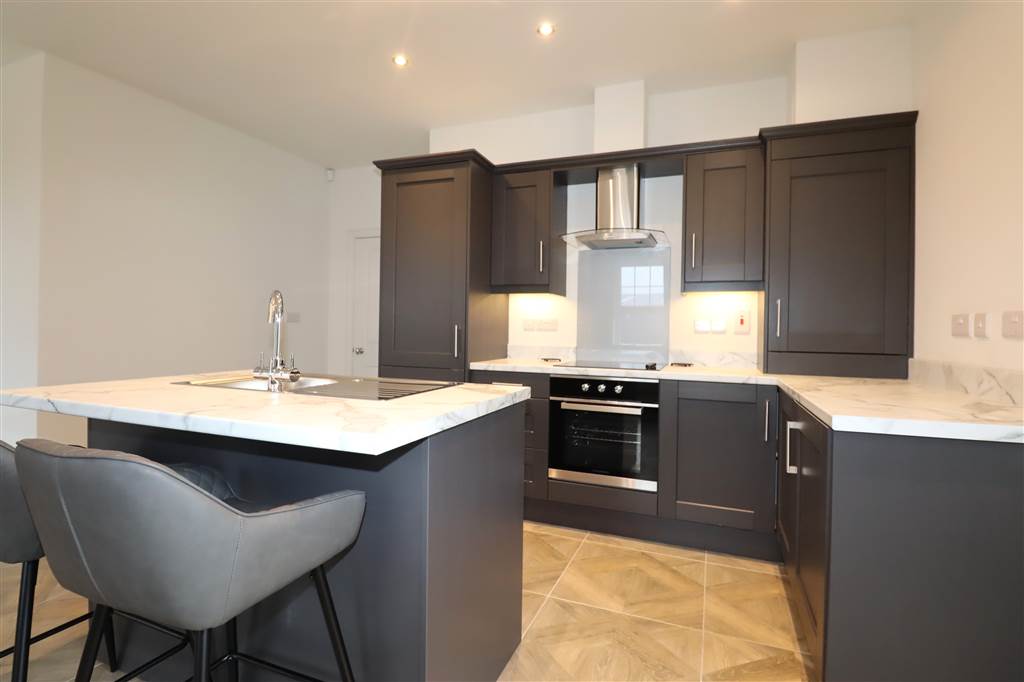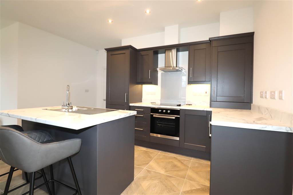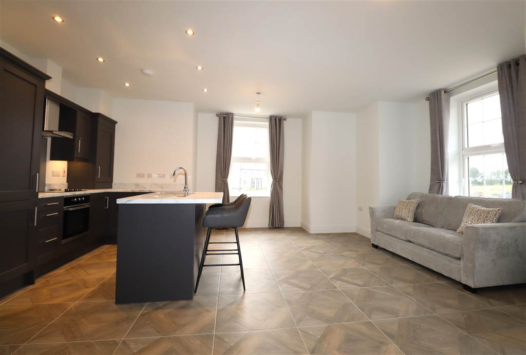 Open Plan Lounge Leading with Electric Fire Leading to Modern Kitchen with Full Range of Appliances including Island