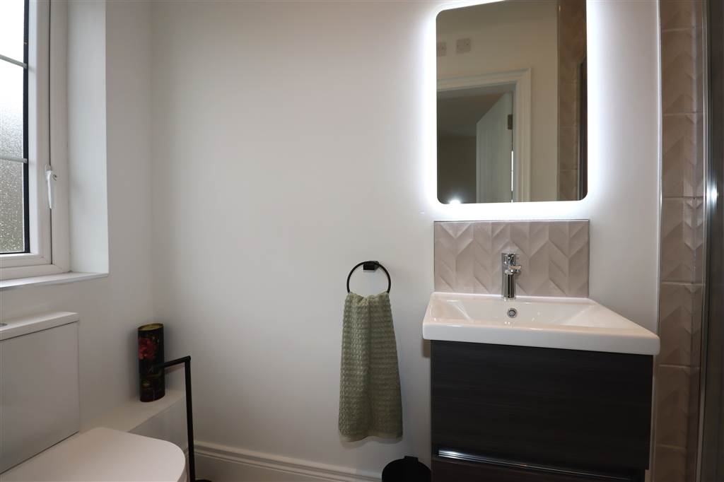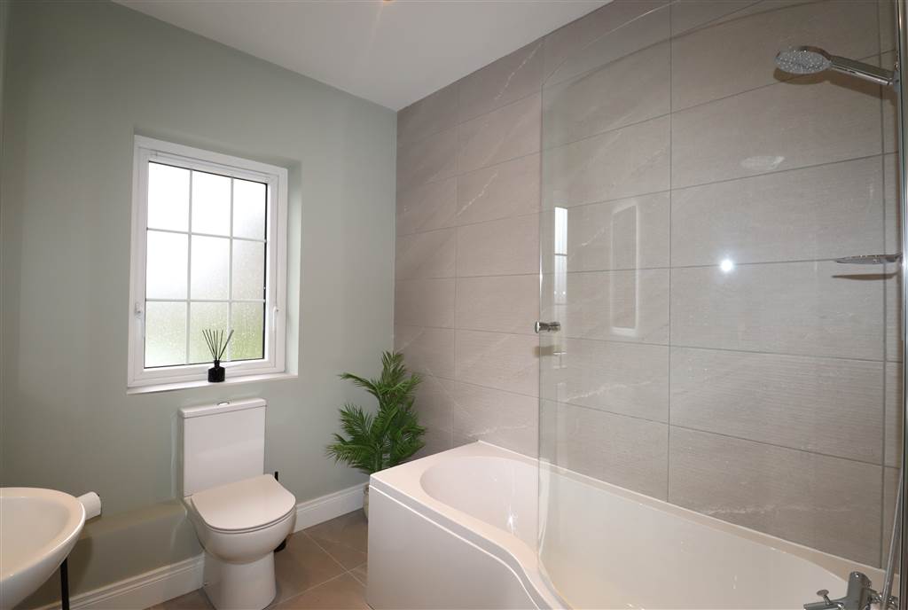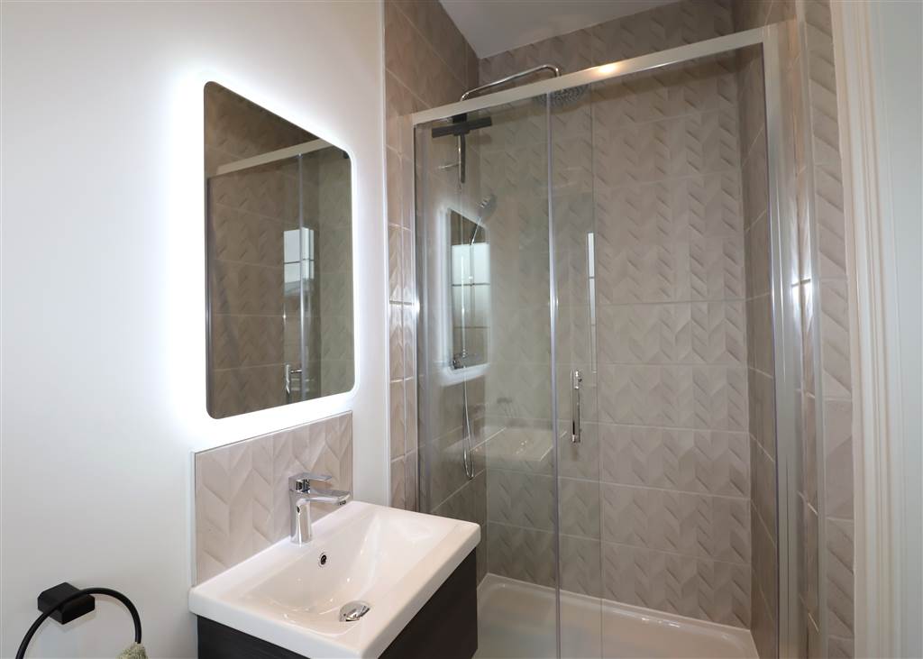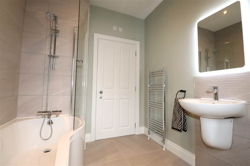 Modern Family Bathroom with WC, Wash Hand Basin, Led Mirror, Bath with Shower Over