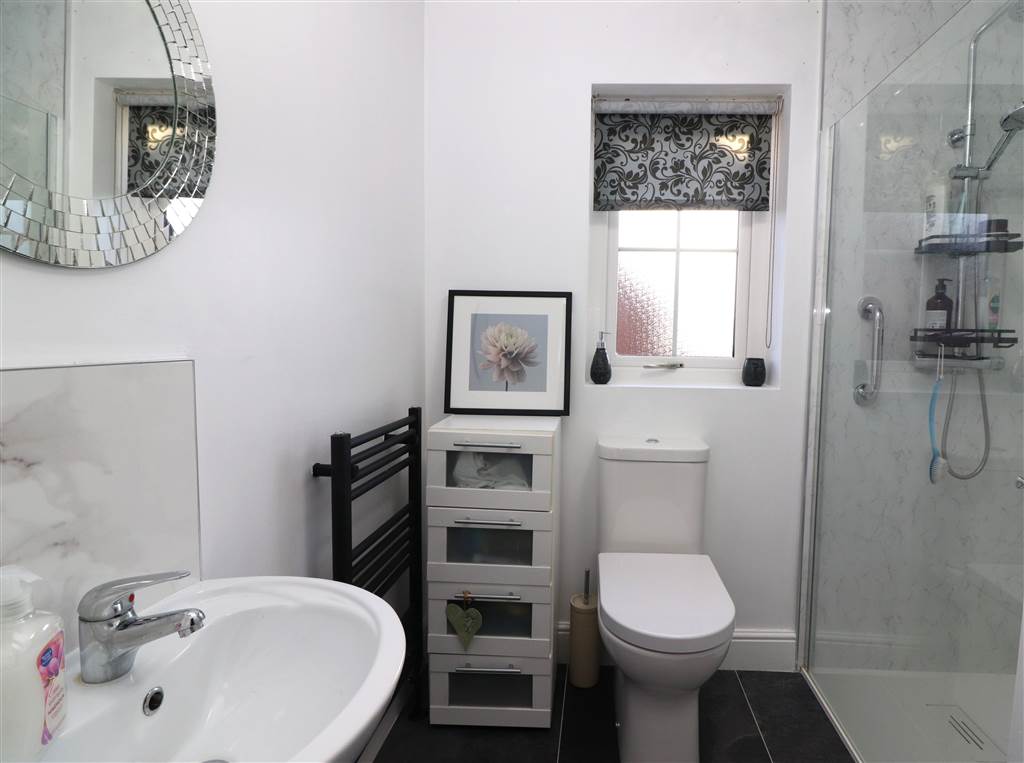 White suite. Large shower cubicle with handshower, rainshower and PVC wall panelling. Wash hand basin. Low flush WC. Tiled floor. Heated towel rail.