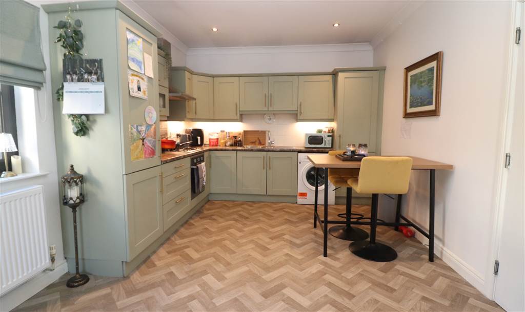 Excellent range of high and low level units. One and a half bowl stainless steel sink unit. Built in gas hob and electric under oven. Stainless steel extractor fan. Integrated fridge/freezer. Plumbed for washing machine. Gas boiler Part tiled walls.