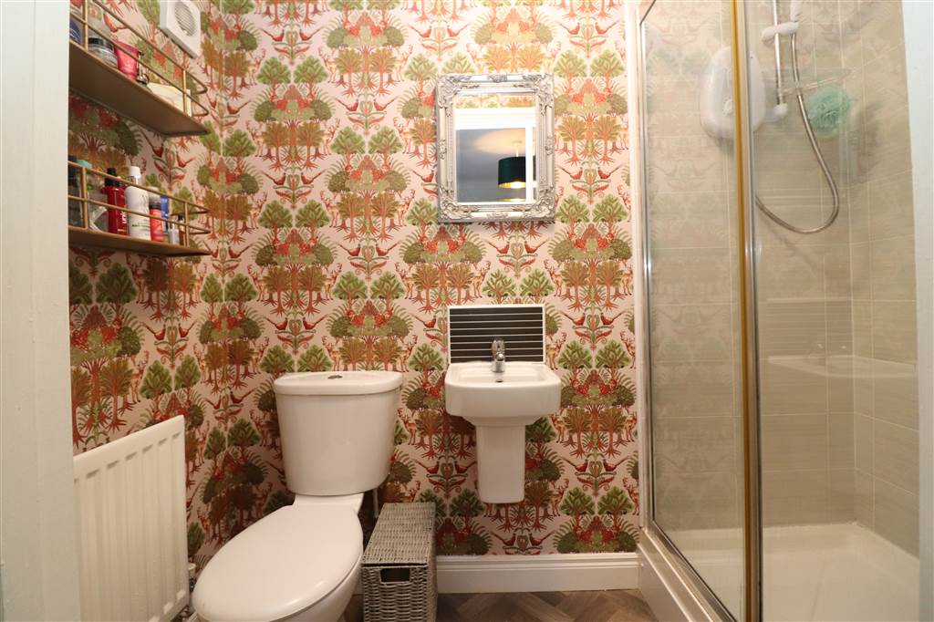 White suite. Large walk in shower cubicle with Mira electric shower. Wash hand basin. Low flush WC. Part tiled walls. Extractor fan.