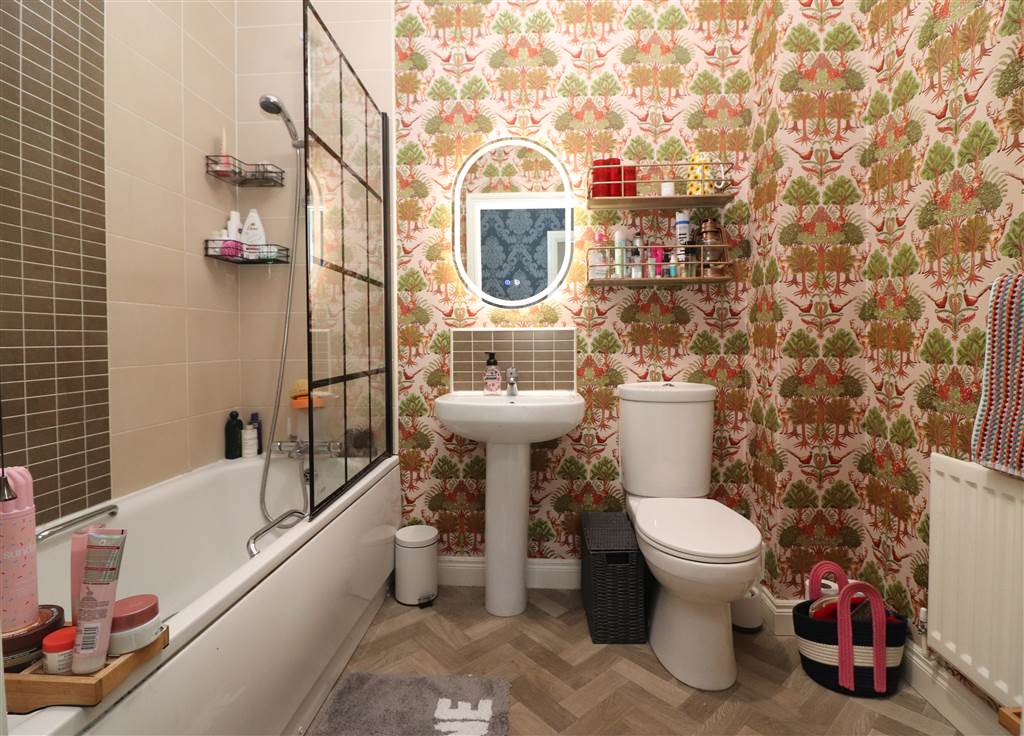 White suite. Panelled bath with mixer taps, shower attachment and shower screen. Pedestal wash hand basin. Low flush WC. Part tiled walls. Illuminated mirror. Extractor fan.