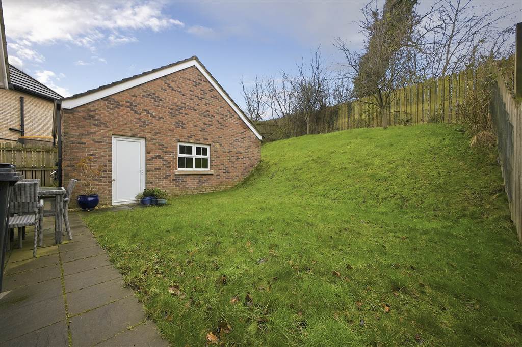 Brick paved driveway. Rear garden in lawn with fencing and trees, Paved patio area. Outside light and tap.