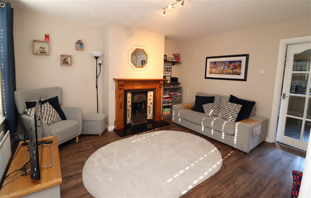 Feature fireplace with open fire. Understairs storage cupboard with light. Glazed door to kitchen/dining.